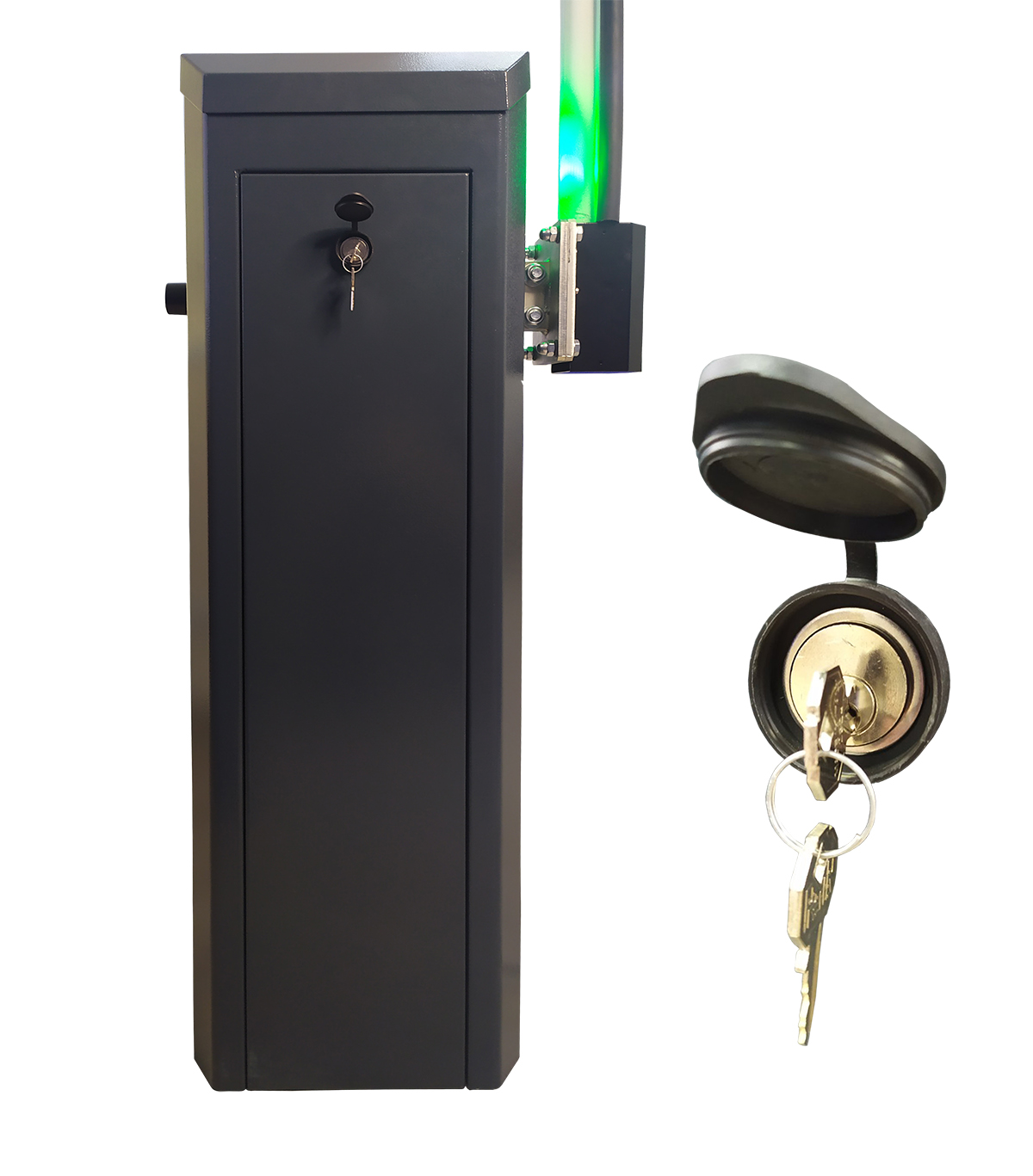 На тумбе размещены уже готовые отверстия для крепления дополнительных аксессуаров (закрыты специальными заглушками, нет необходимости сверлить и повреждать краску). Так же сверху тумбы может быть установлена светодиодная подсветка, за счет которой, шлагбаум TRAFIK/N не останется не замеченным даже при ярком солнечном свете. Все шлагбаумы DEA имеют индивидуальные ключи для доступа к блоку управления и электроприводу, а также для управления шлагбаума в ручной режим. Это защищает механизм от несанкционированных действий посторонних лиц. В шлагбауме TRAFIK цилиндр замка защищен от воздействия атмосферных осадков резиновой заглушкой.