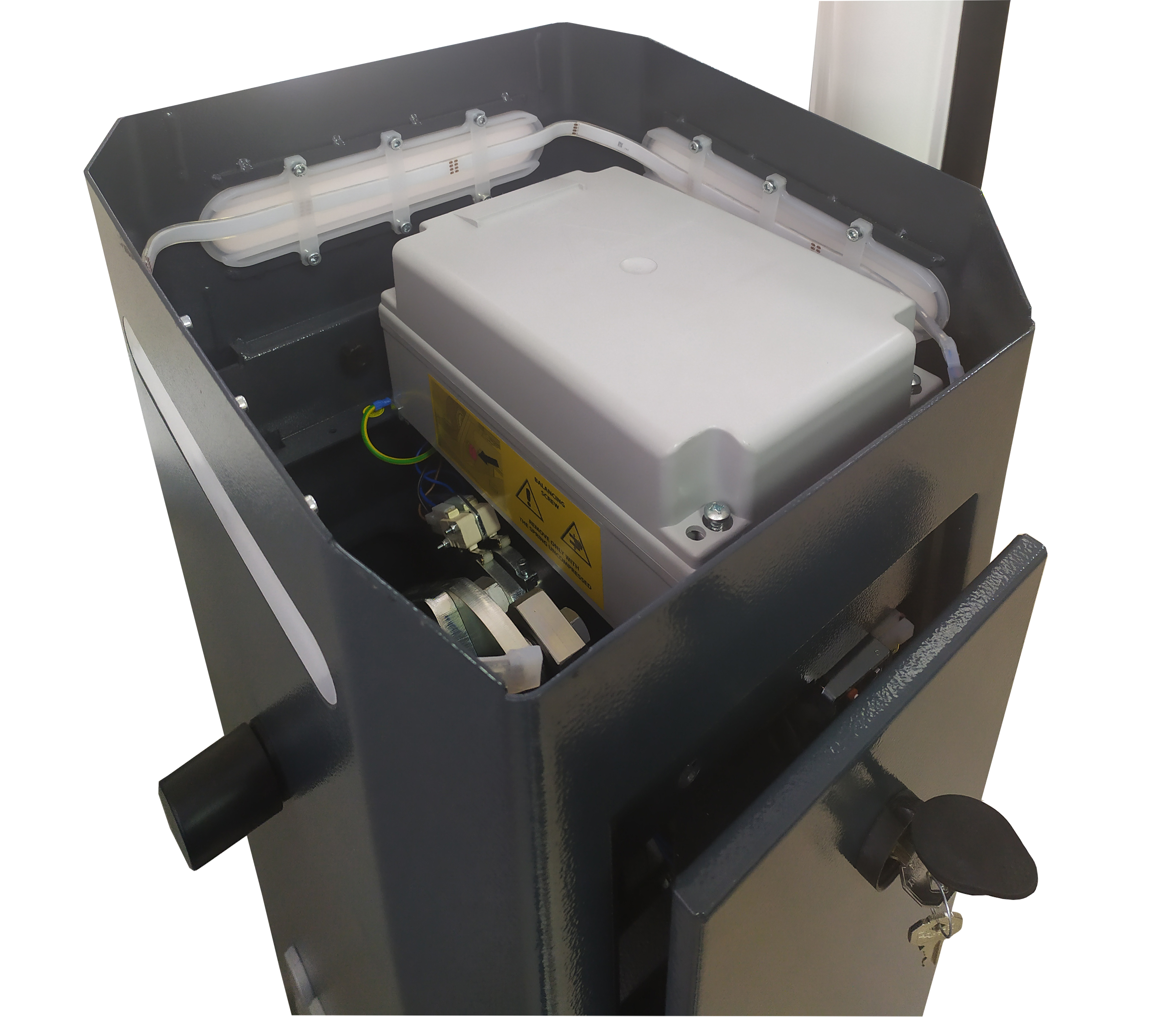 Для технического обслуживания и облегчения доступа к внутренним механизмам, тумба шлагбаума TRAFIK/N имеет 2 дверцы и съемную крышку