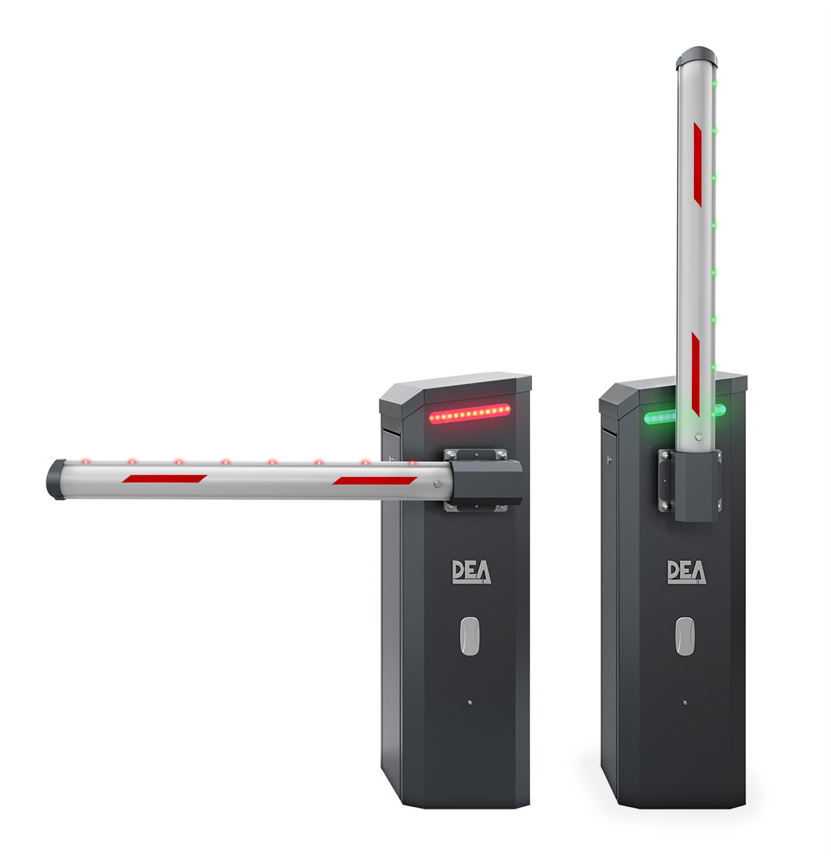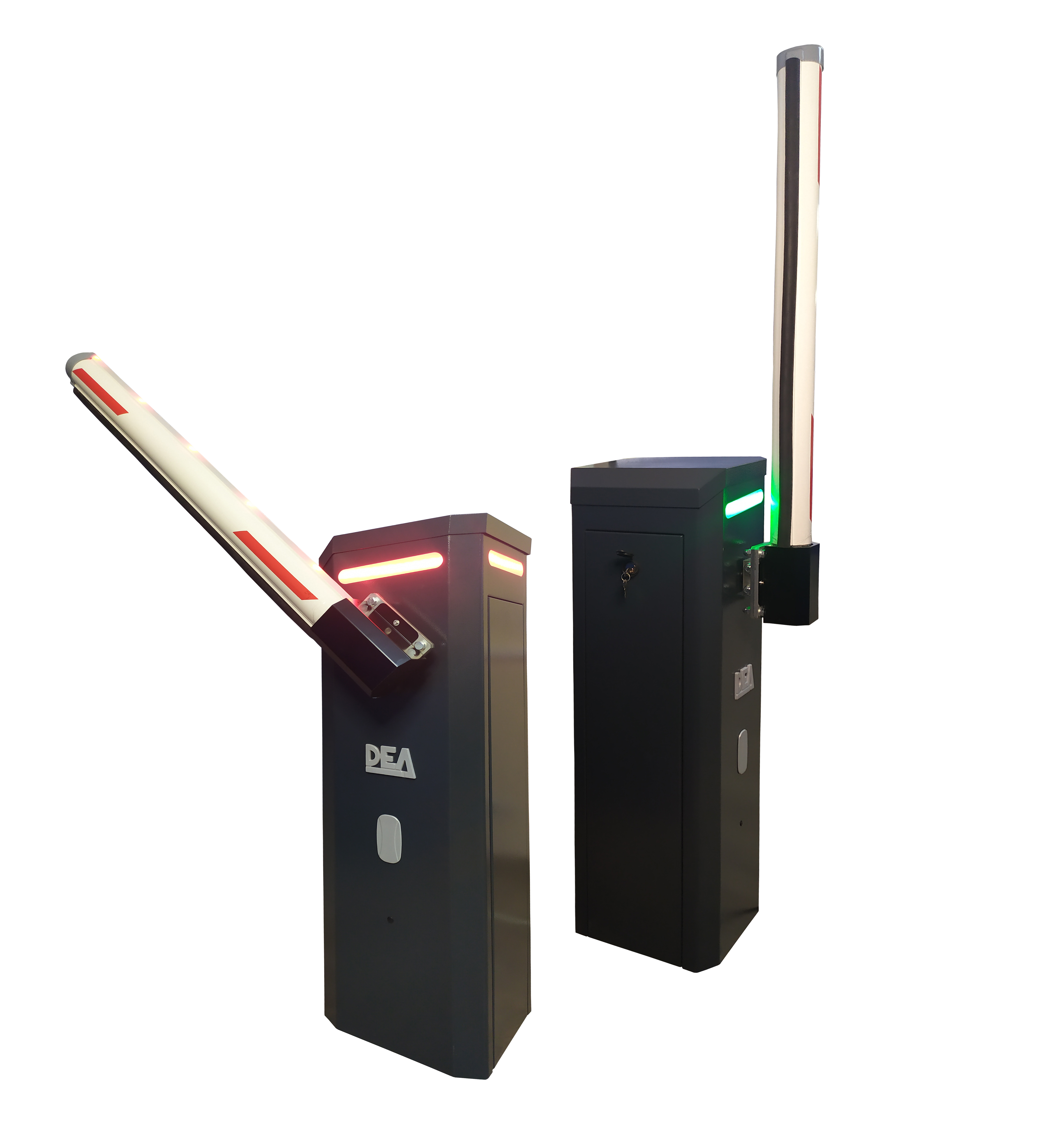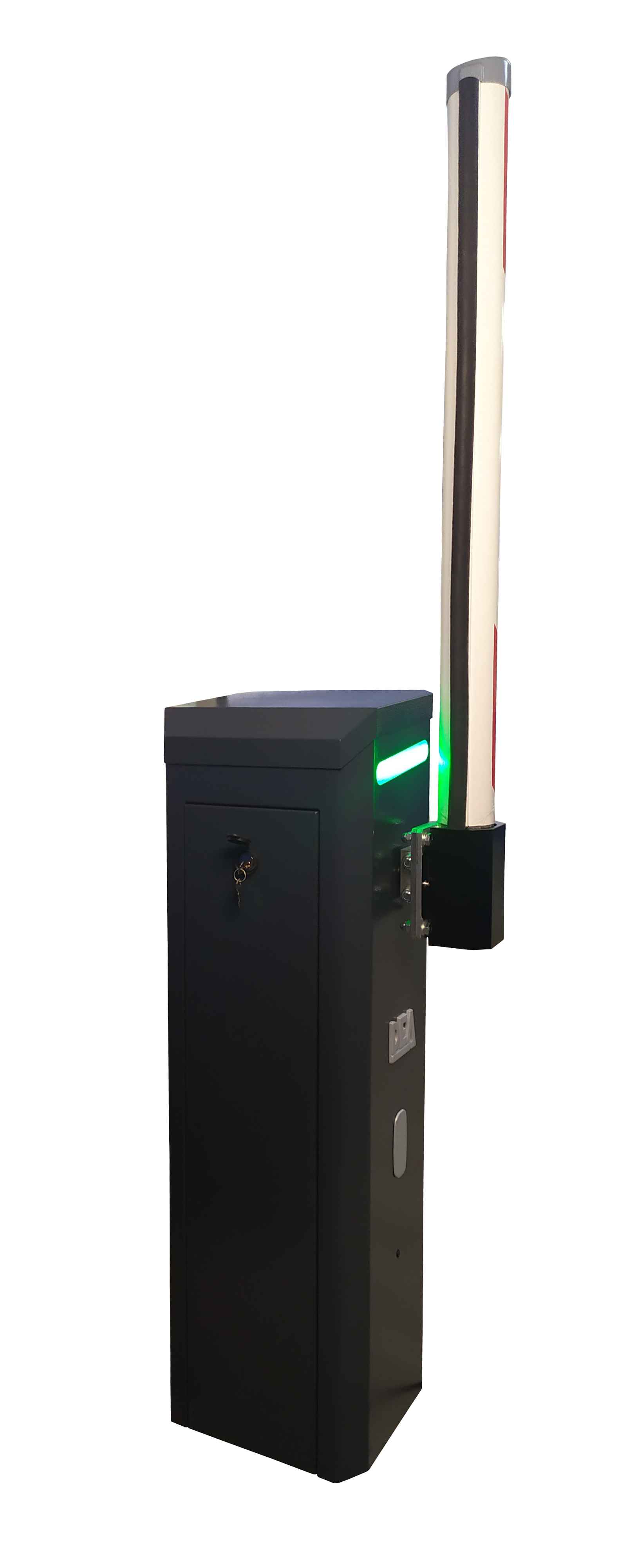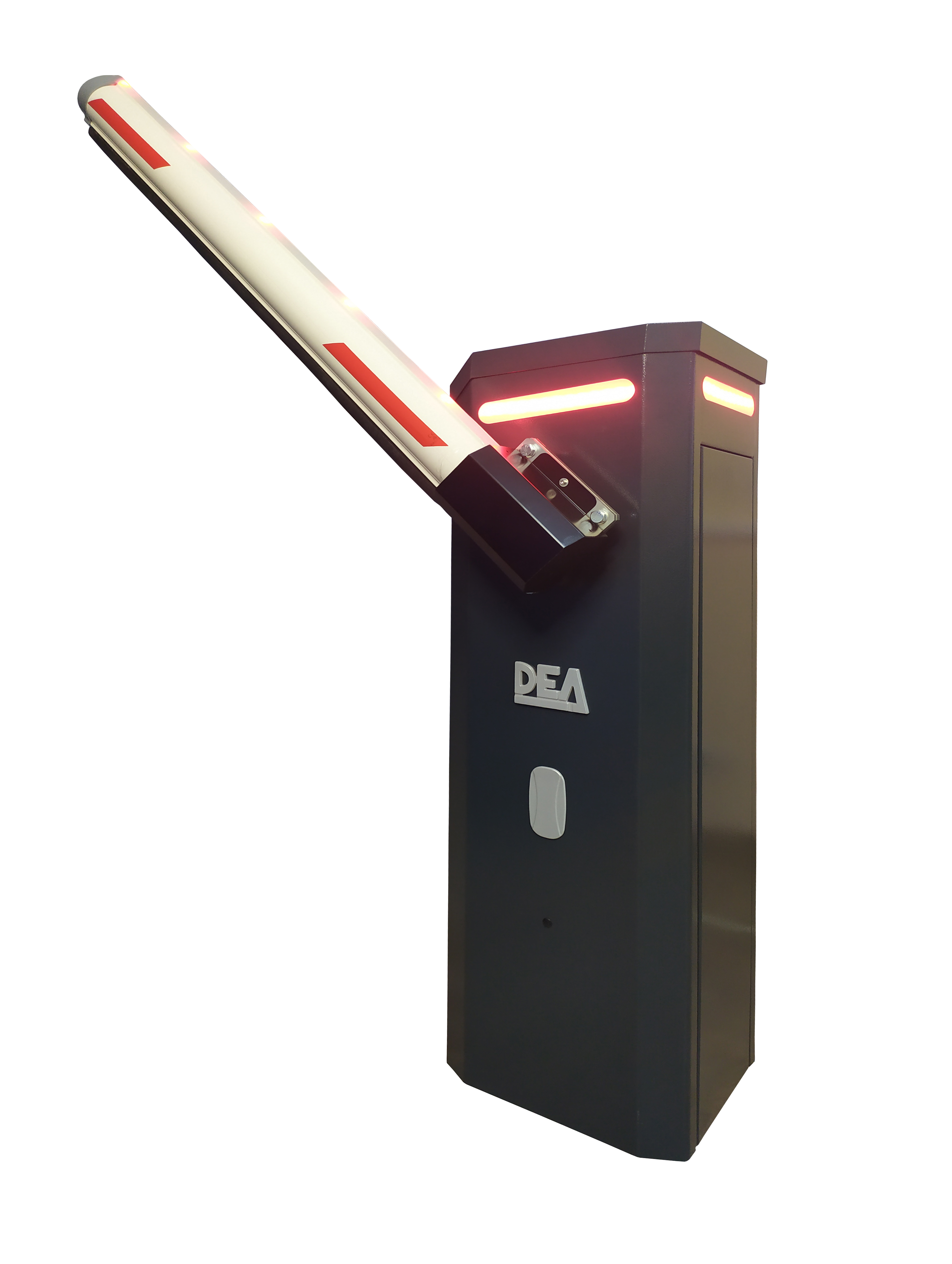 На тумбе размещены уже готовые отверстия для крепления дополнительных аксессуаров (закрыты специальными заглушками, нет необходимости сверлить и повреждать краску). Так же сверху тумбы может быть установлена светодиодная подсветка, за счет которой, шлагбаум TRAFIK/N не останется не замеченным даже при ярком солнечном свете. Все шлагбаумы DEA имеют индивидуальные ключи для доступа к блоку управления и электроприводу, а также для управления шлагбаума в ручной режим. Это защищает механизм от несанкционированных действий посторонних лиц. В шлагбауме TRAFIK цилиндр замка защищен от воздействия атмосферных осадков резиновой заглушкой.