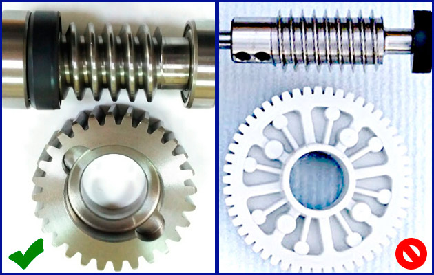 На фото выше слева вы можете видеть высокоуглеродистый стальной червячный вал редуктора привода ворот LIVI6 (в разрезе), который передаёт усилие с электродвигателя. Вал установлен на надёжных подшипниках, погружён целиком в низкотемпературную смазку (до - 40 градусов по Цельсию). В дополнительных комментариях, вероятно, данное фото не нуждается, каждый фрагмент этой детали просто "излучает" надёжность. Попробуйте найти фото аналогичной детали у приводов других производителей, результат сравнения будет очевиден. На фото справа, для сравнения, вы можете видеть червячный вал одного именитого итальянского бренда. Червячный вал передаёт усилие электродвигателя на центральную шестерню, выполненную из стали и имеющую скос зубов, для повышения предельной нагрузки и снижения шума от редуктора.