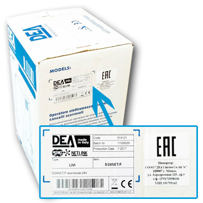 Поставляется привод сдвижных ворот LIVI6/24NET/F в бело-синей коробке. В обязательном порядке на ней указана страна производства - Италия, артикул, дата производства. Имеются также знаки подтверждающие соответствие нормам CE (Европейские нормы), EAC (декларация о соответствии нормам таможенного союза). Обязательной также является наклейка с указанием первого импортёра автоматики DEA на территорию Беларуси, России, Казахстана и другие страны СНГ (СООО "ДЕА Систем Си Ай Эс).