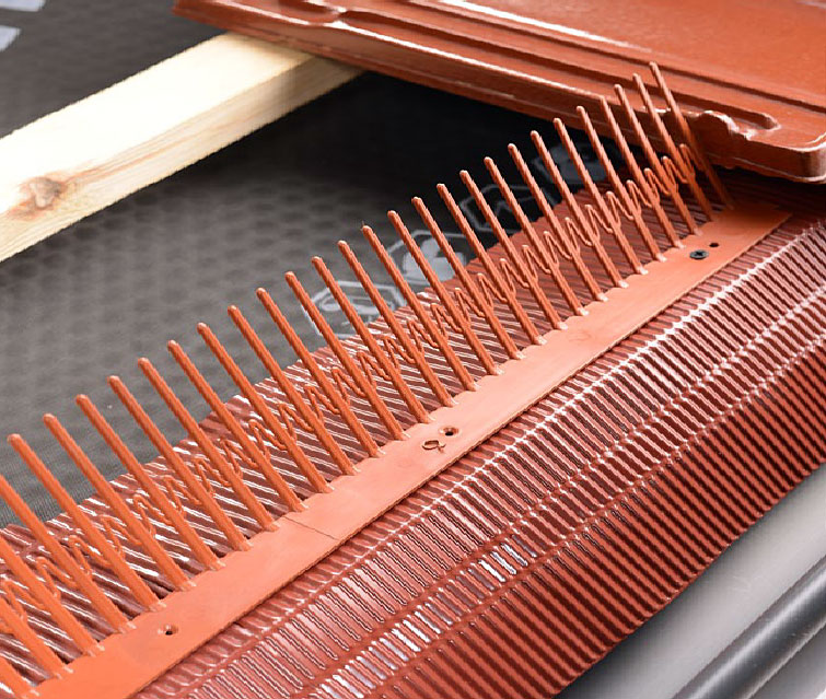 Применение: основание гребня свеса способствует беспрепятственному прохождению воздуха в пространстве между мембраной и черепицей. Гребешковая часть служить для выравнивания, при монтаже, первого, водосточного ряда черепицы.