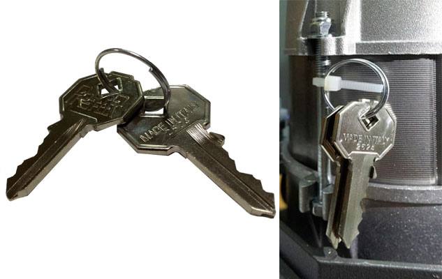 В комплект также входит два ключа для системы разблокировки (перевода ворот в режим ручного передвижения). Ключи находятся под внешней крышкой электропривода. Они закреплены непосредственно на электродвигателе при помощи пластиковой стяжки.