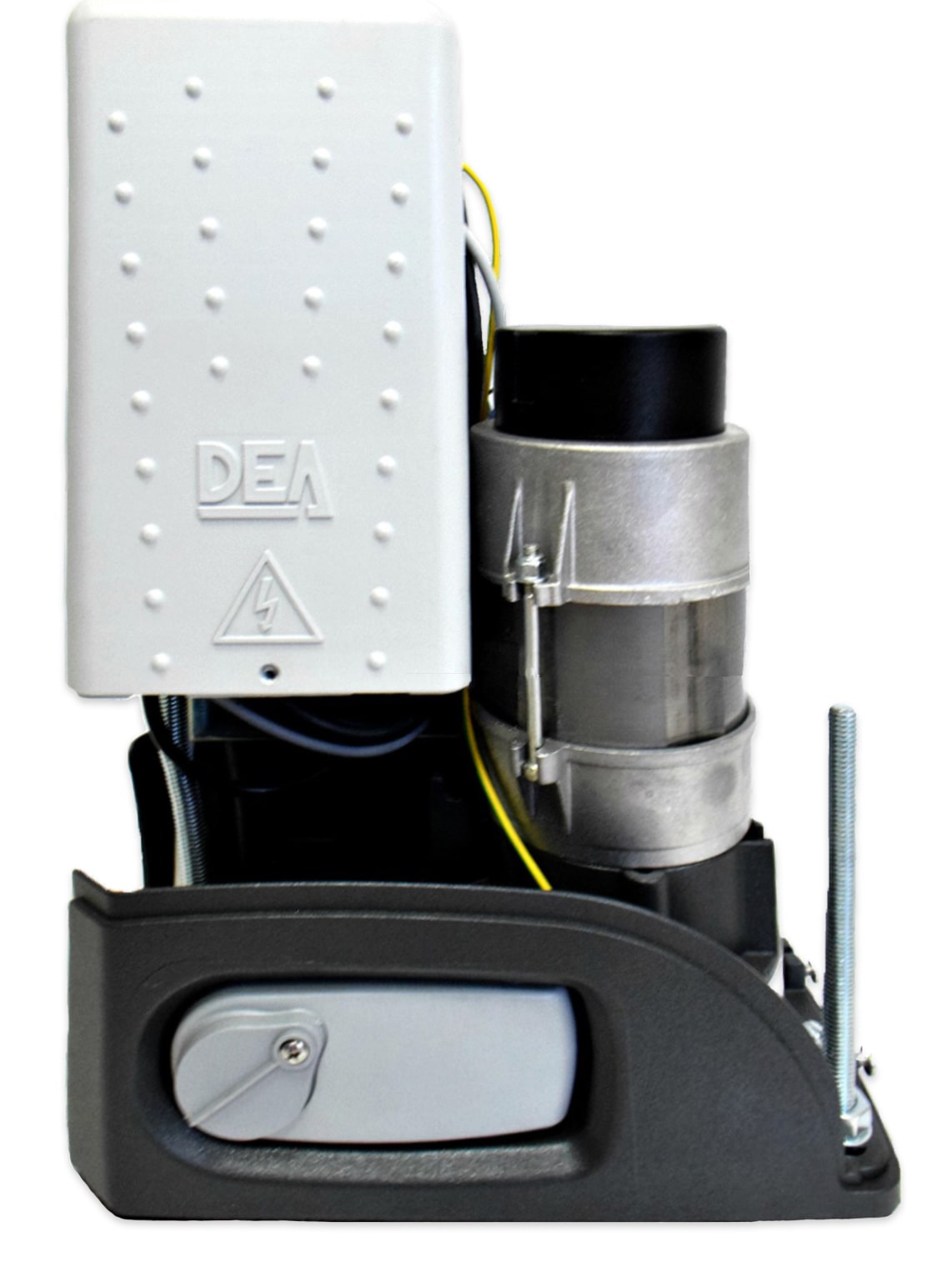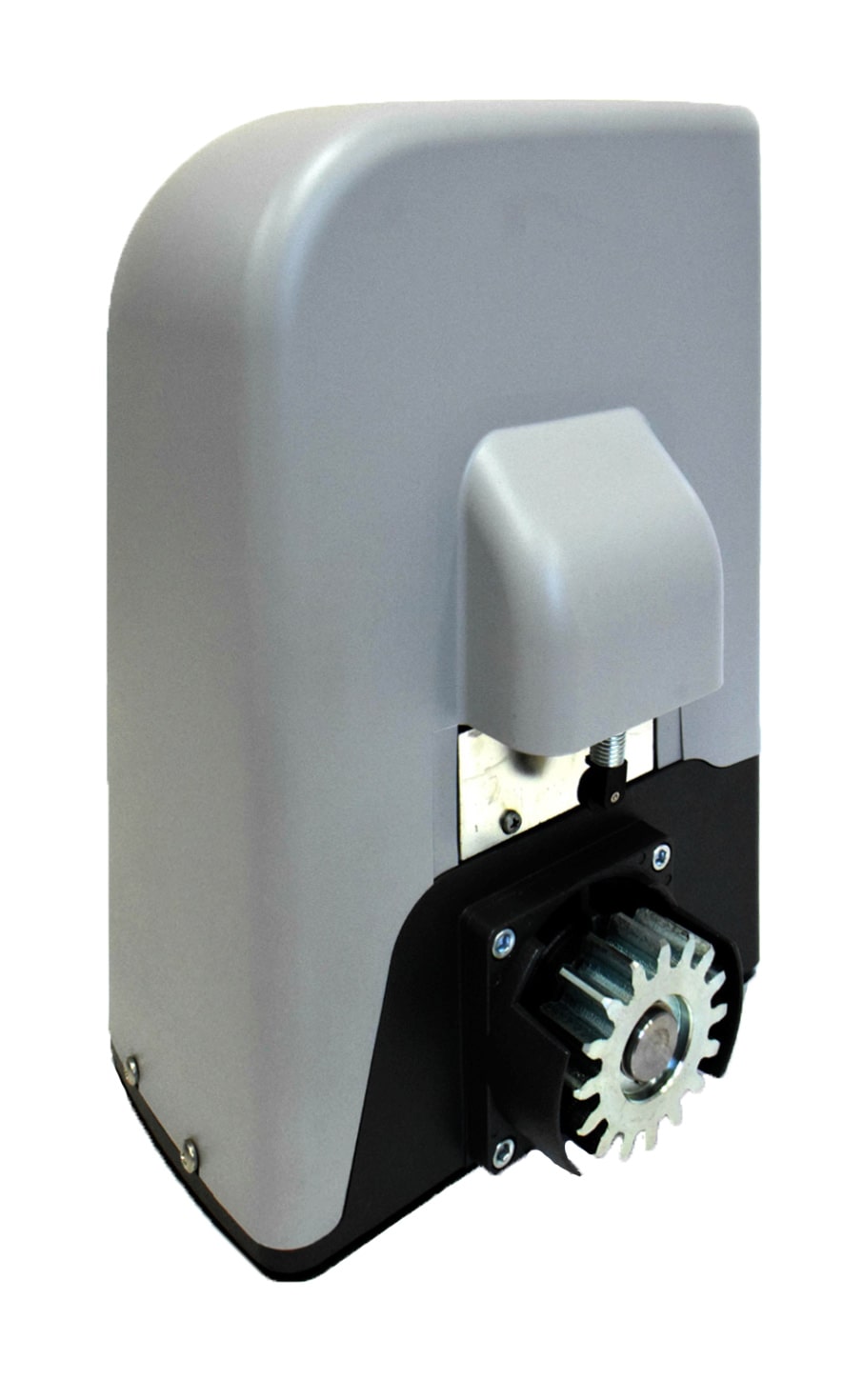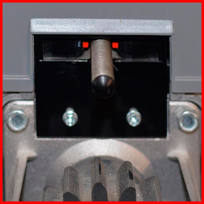 На фото слева вы можете видеть механизм концевых выключателей DEA. Он расположен вертикально и накрыт сверху выступом внешнего кожуха. Это надёжно защищает его от замерзания в зимний период, обеспечивая надёжную работу электропривода в любую погоду при любых неблагоприятных условиях. Кроме того, данная конструкция позволяет использовать этот привод с полимерной, зубчатой рейкой у которой крепежные кронштейны расположены сверху и крепятся в рамку ворот. Электропривод LIVI с нейлоновой рейкой устанавливается полностью стандартно, без каких-либо проблем.