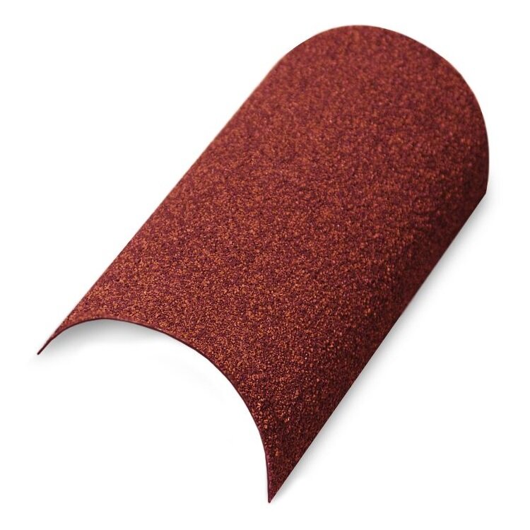 Композитная черепица предоставляет собой разновидность металлической черепицы, но отличается тем, что с внешней стороны имеет посыпку из базальтового гранулята. Полукруглый конек марки LUXARD является доборным элементом и изготовлен из оцинкованной стали. Изделие служит для оформления коньков и ребер на скатной кровле, а также маскировки и устройства подкровельной вентиляции. Конек прибивается при помощи специальных гальванизированных гвоздей или саморезов на хребтовый брус сечением 50х50 мм. Монтаж идет с низу вверх, рекомендуемый нахлест составляет 2 см.