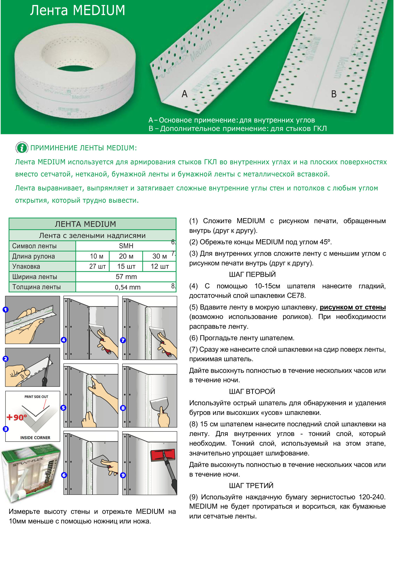 Лента MEDIUM применяется для соединения плит гипсокартона во внутренних углах и на плоских поверхностях вместо сетки , ленты бумажной и бумажной ленты с алюминиевыми вставками