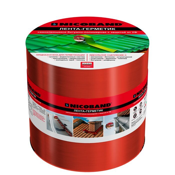 Лента Nicoband представляет собой самоклеящийся бутилкаучуковый материал для наружных работ. Изделие изготавливают посредством нанесения битумно-вяжущего на алюминиевую армированную пленку. Соединительная лента выполнена в красном цвете.