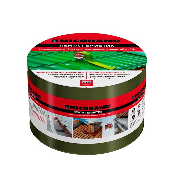 Лента Nicoband представляет собой самоклеящийся материал для наружных работ. Изделие изготавливают посредством нанесения битумно-вяжущего на алюминиевую армированную пленку. Лента выполнена в зеленом цвете.
