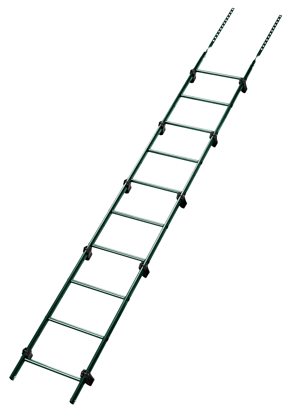 Кровельная лестница крепится с помощью конькового кронштейна к коньковому брусу или обрешётке противоположного ската. Лестница опирается на кровельное покрытие с помощью пластиковых опор, что исключает повреждения кровельного материала.