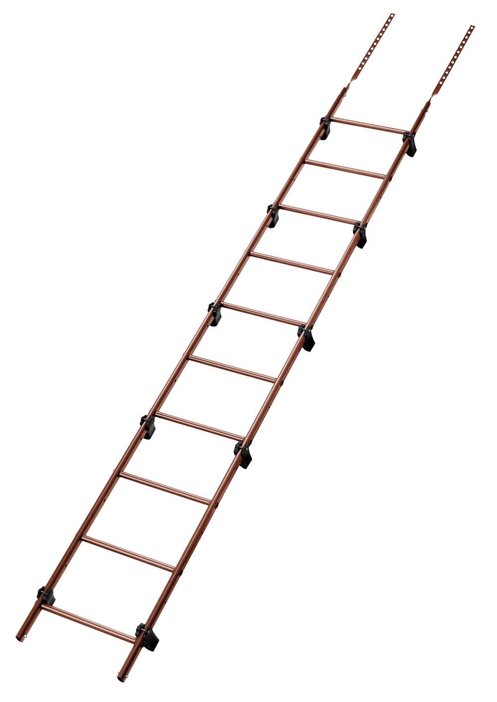 Кровельная лестница крепится с помощью конькового кронштейна к коньковому брусу или обрешётке противоположного ската. Лестница опирается на кровельное покрытие с помощью пластиковых опор, что исключает повреждения кровельного материала.