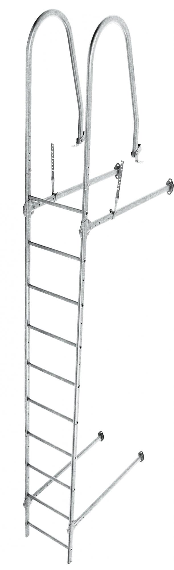 Стеновая лестница крепится с помощью стеновых кронштейнов к фасаду здания, дуговыми поручнями к обрешетке кровли и дополнительно фиксируется к карнизу соответствующими кронштейнами.