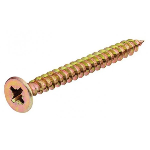 Потайная головка, крестообразный шлиц POZI, острый наконечник, крупная резьба, защитное покрытие - желтый цинк.