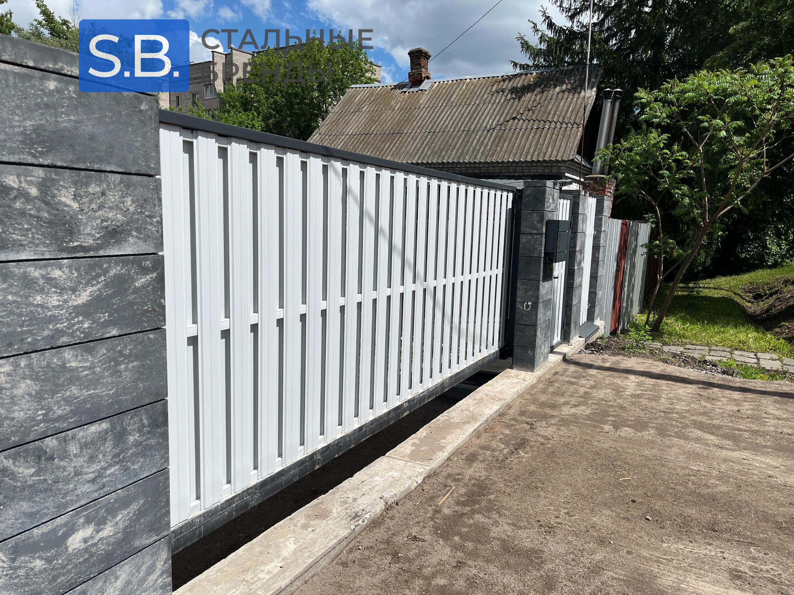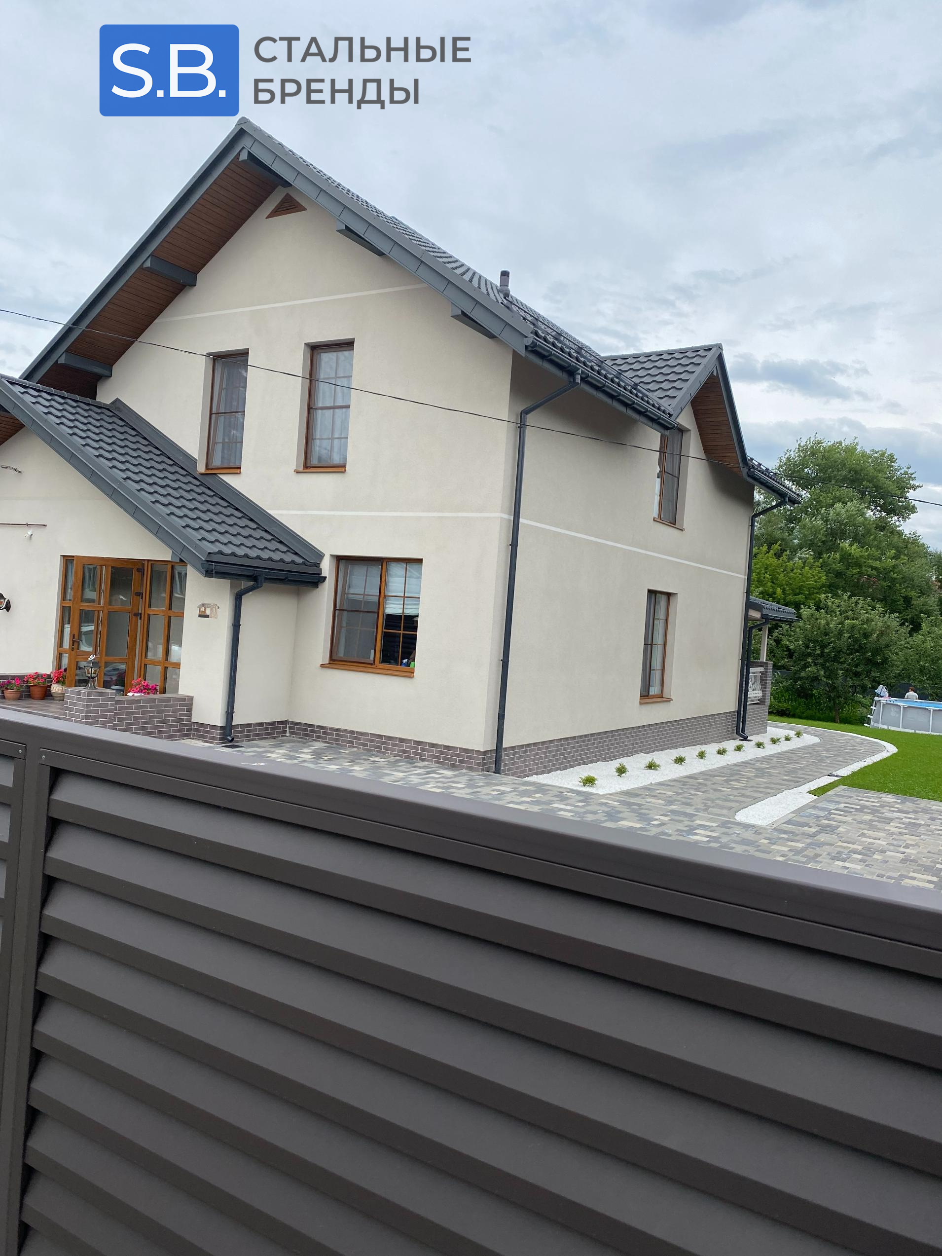Металлочерепица Будмат графит, забор из кирпича с наполнение жалюзи